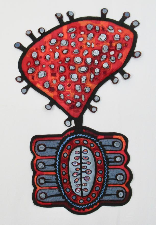 44"x 45" Recycled materials, cardboard, fabric scraps, acrylic paint, embroidery threads, free motion stitching, machine stitching, hand stitching